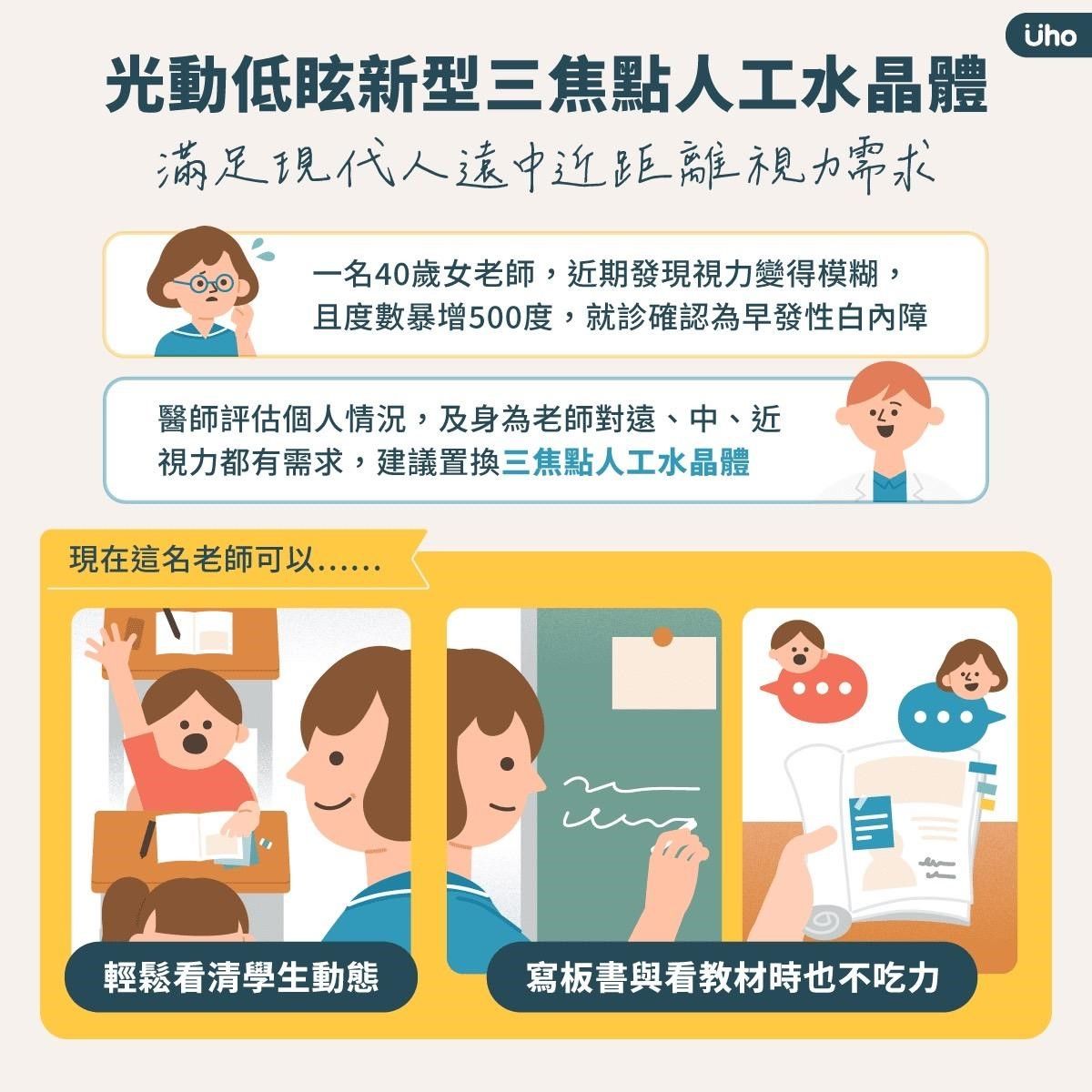 一名40歲老師近期發現視力變得模糊,度數更從700度暴增至1200度,她驚覺不對趕緊就醫,確認是早發性白內障,必須儘早手術。由於老師的職業對遠、中、近視力都有需求,醫師其生活需求後,適合使用多焦點人晶體,讓手術後不僅解決白內障問題,也不再需要戴眼鏡。現在寫板書、看學生都更輕鬆,也慶幸自己提早就醫,不影響職涯。